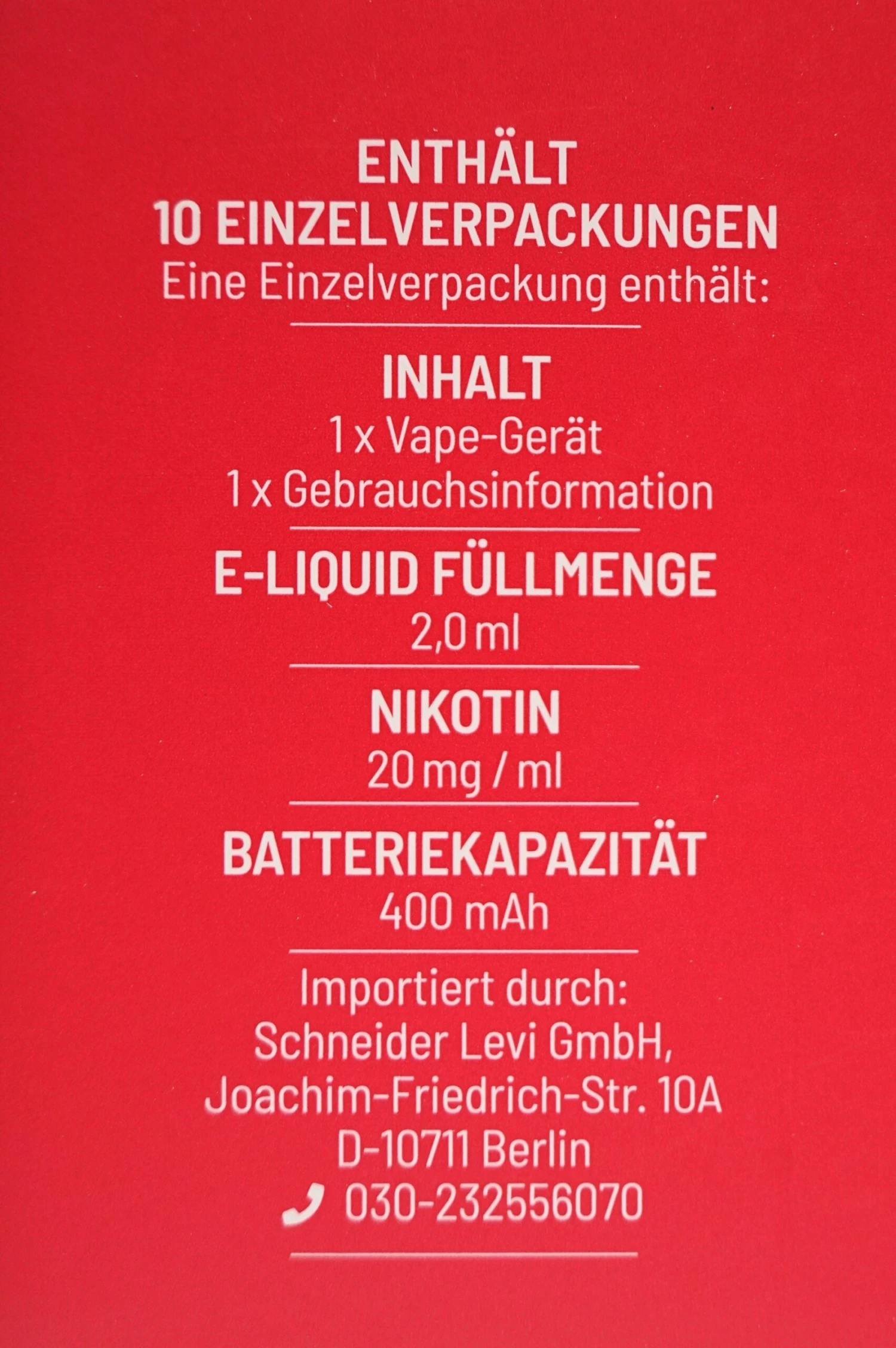 Nikotingehalt: 20 mg/ml Gesamtnikotingehalt: 40 mg (entspricht 20 mg/ml)