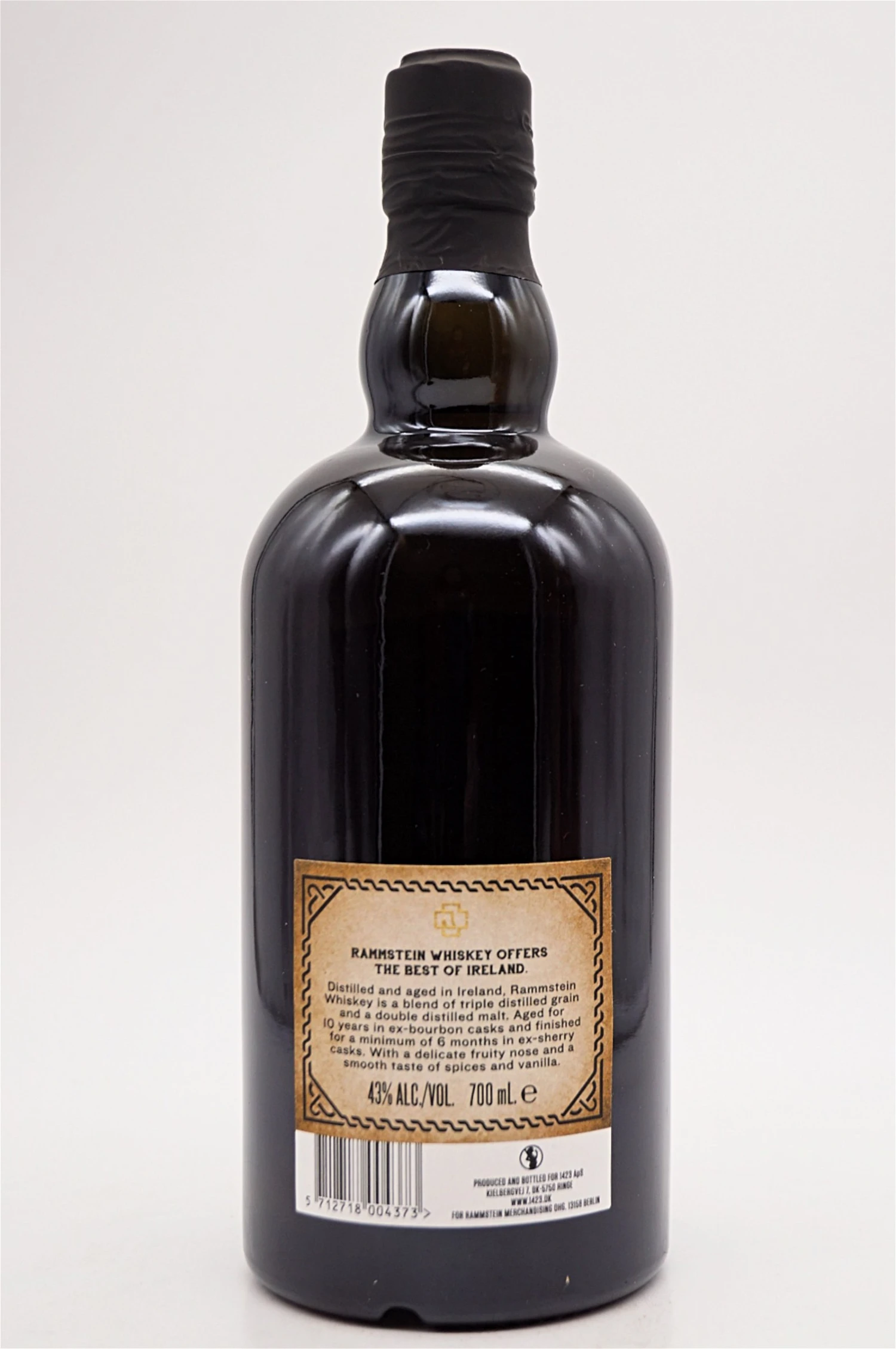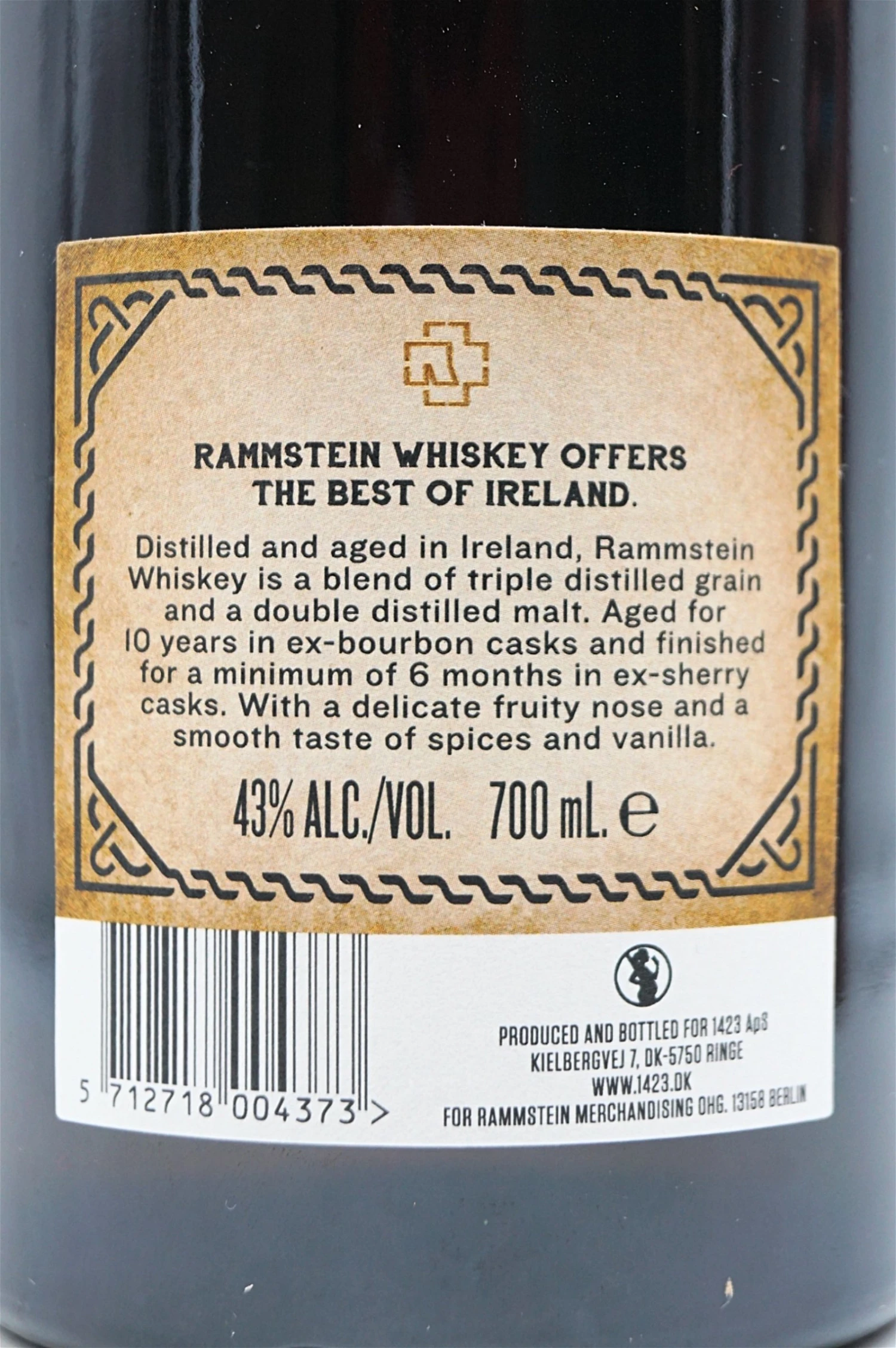 Der in Irland destillierte und gereifte Rammstein Whiskey ist eine Mischung aus dreifach destilliertem Getreide und doppelt destilliertem Malz.