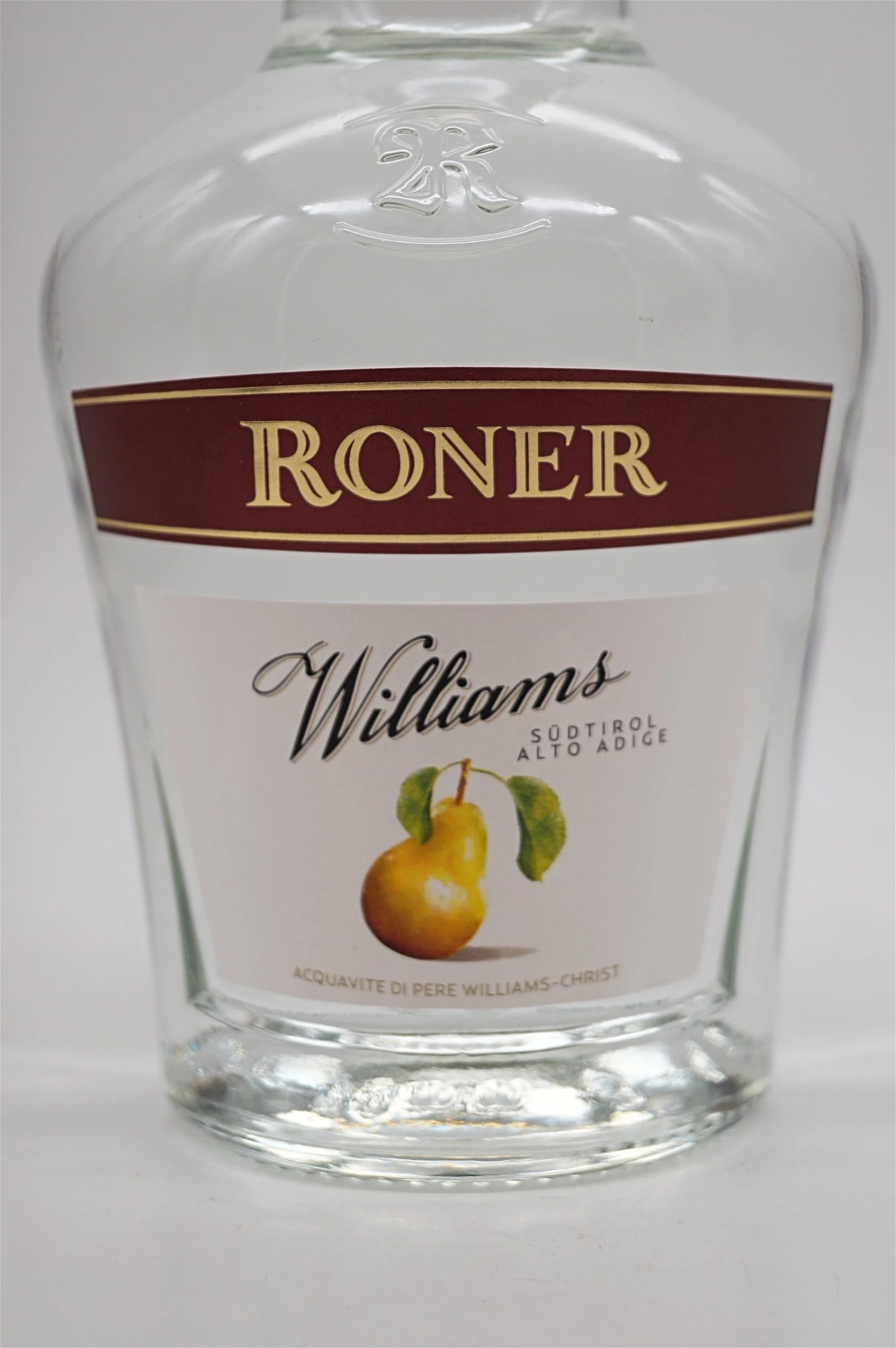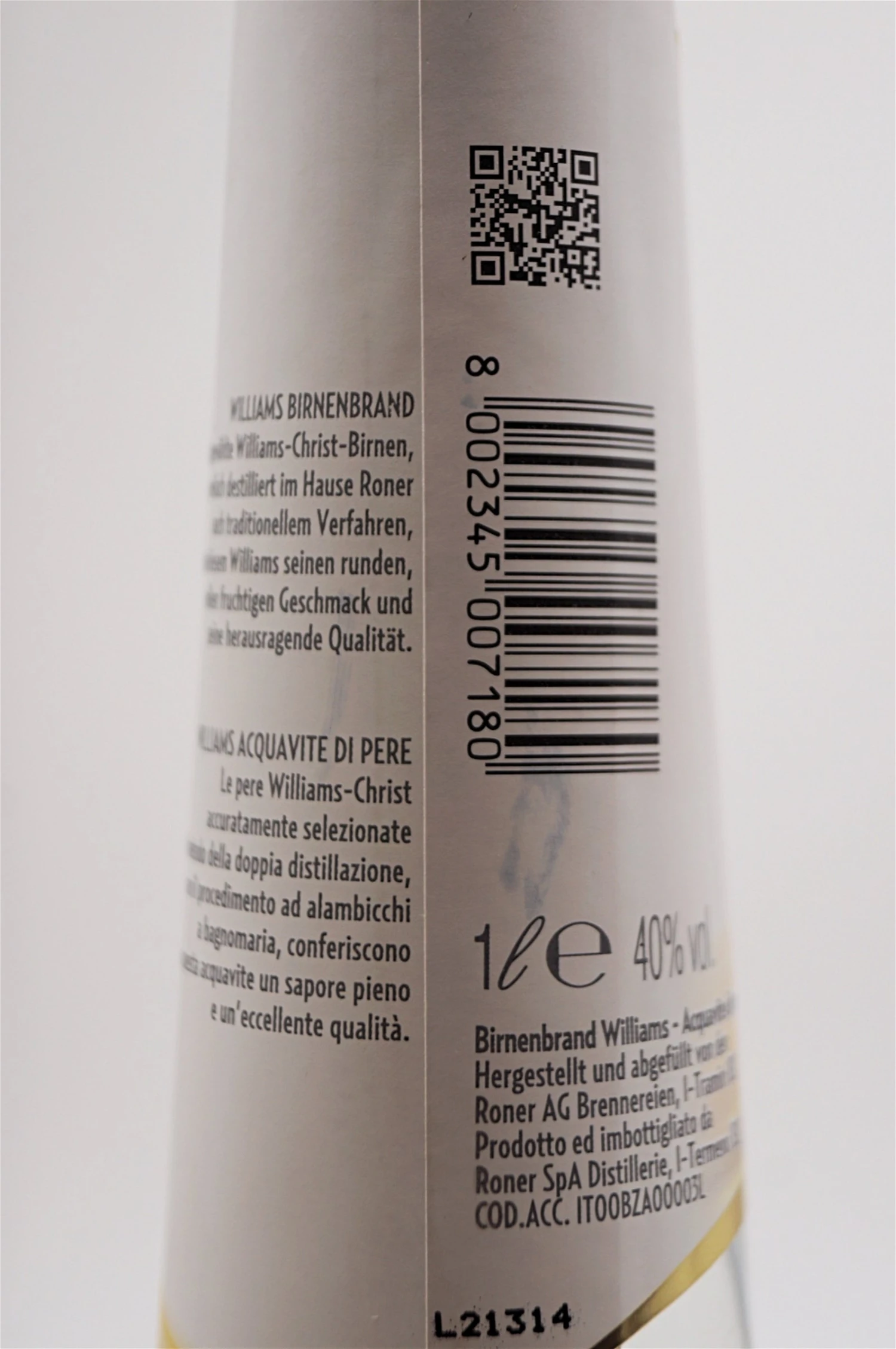 Der mehrfach ausgezeichnete Birnenbrand erhält seinen runden, vollen und fruchtigen Geschmack durch die zweifache Destillation erlesener Williams-Christ-Birnen nach dem von Roner perfektioniertem Blasenverfahren.