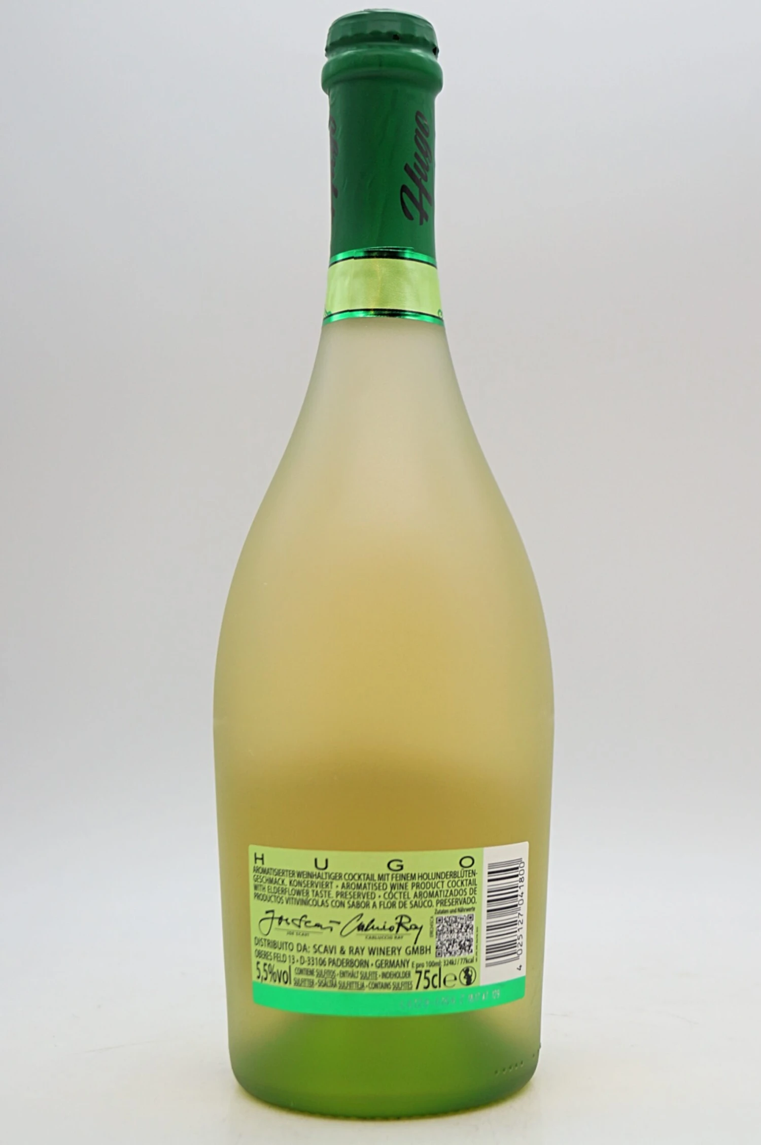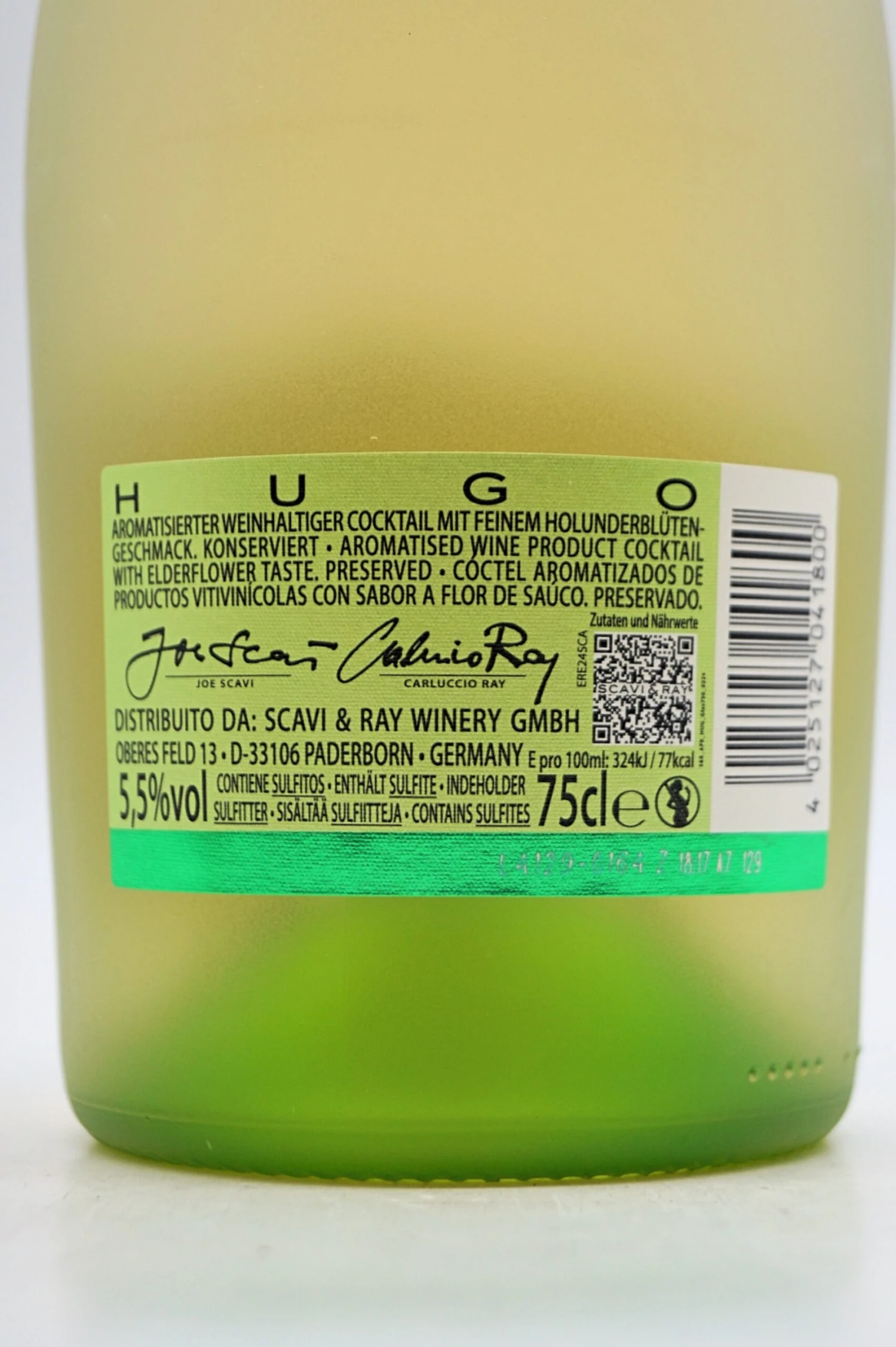 Andrea Scavi, der Sohn von Joe Scavi, tritt in die Fußstapfen seines Vaters. Die junge Linie, zeigt die SCAVI & RAY Winery seine Interpretation von Tradition und modernem italienischen Genuss. Scavi & Ray HUGO begeistert als spritziger Cocktail Aperitivo mit einem gelungenen Mix aus hochwertigem Secco, süßlichem Holunderblütensirup, erfrischender Limette und Soda. Durch die perfekte Kombination sorgt der aromatisierte weinhaltige Cocktail mit seiner deutlichen Süße überall für ein Lächeln. Mit 5,5 % Vol. Alkoholgehalt ist er eines der beliebtesten süßen Erfrischungsgetränke.
