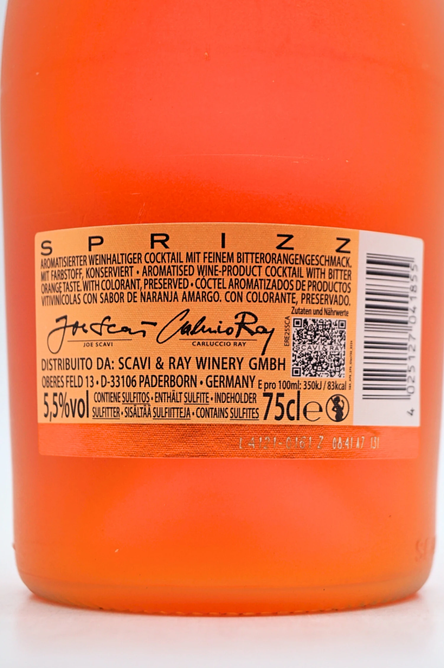 Der Scavi & Ray SPRIZZIONE ist ein absoluter Premium-Aperitif aus Prosecco, Bitter-Orangen-Likör und Orangenspalten, der mit aufregender Frische überrascht. Das mediterrane, weinhaltige Mixgetränk sorgt durch seine überzeugend arrangierte Bitterorange für einen prickelnden Genuss. Sauber und saftig am Gaumen, sauber in der Nase mit Nuancen von Grapefruit und floralen Orangennoten. Seine verhaltene Säure entfaltet sich wunderbar bei einem moderaten Alkoholgehalt von 5,5 % Vol..