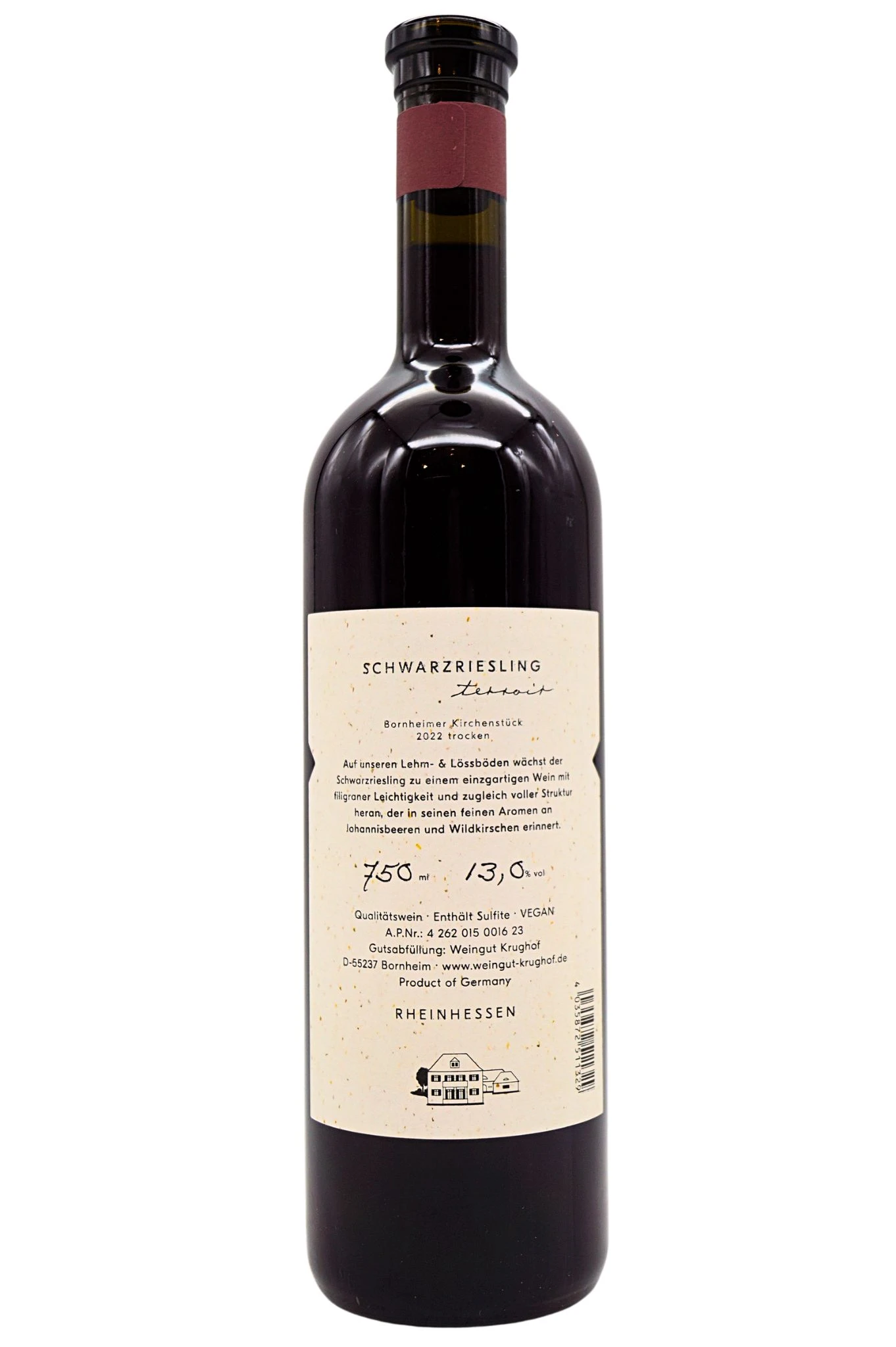 Auf den Lehmböden von Weingut Krughof wächst der Schwarzriesling zu einem Wein mit filigraner Säure und zugleich voller Struktur heran. In seinen Aromen erinnert er an Kirschen & Johannisbeeren.
